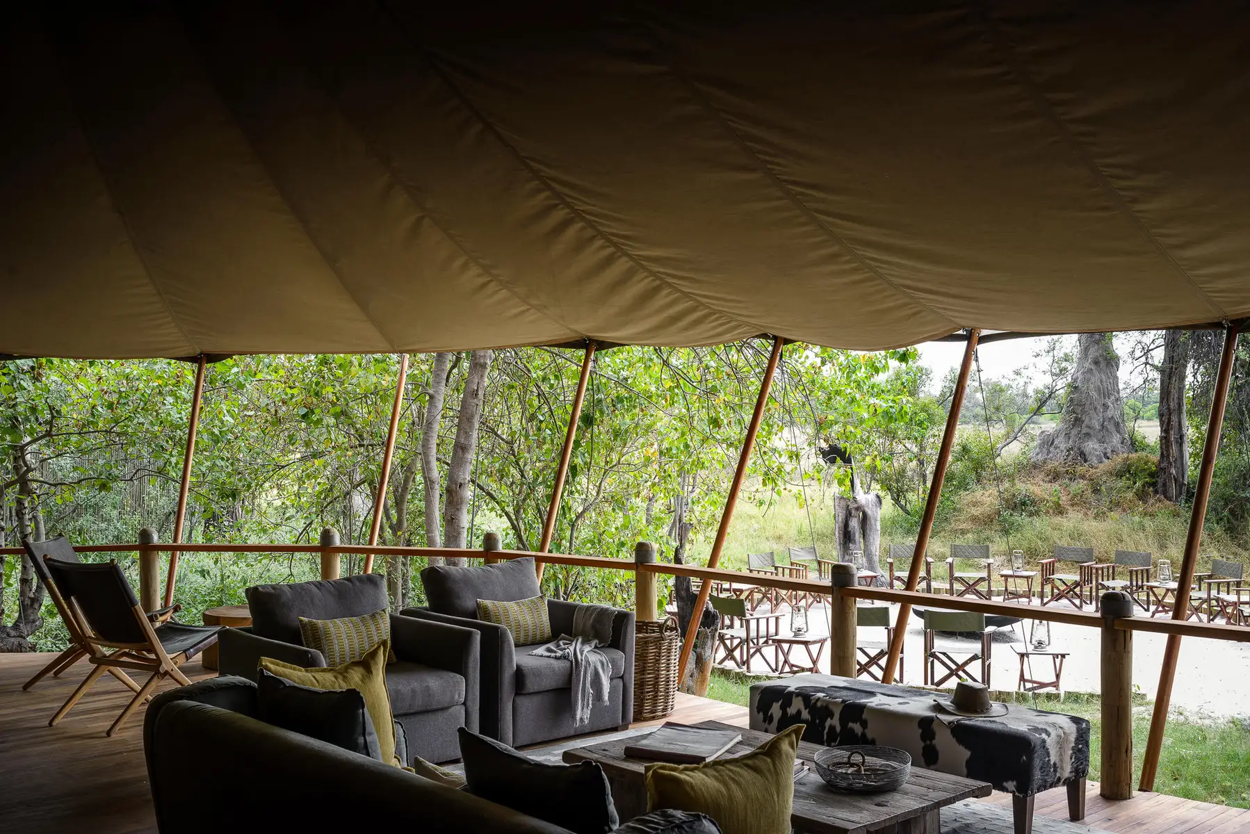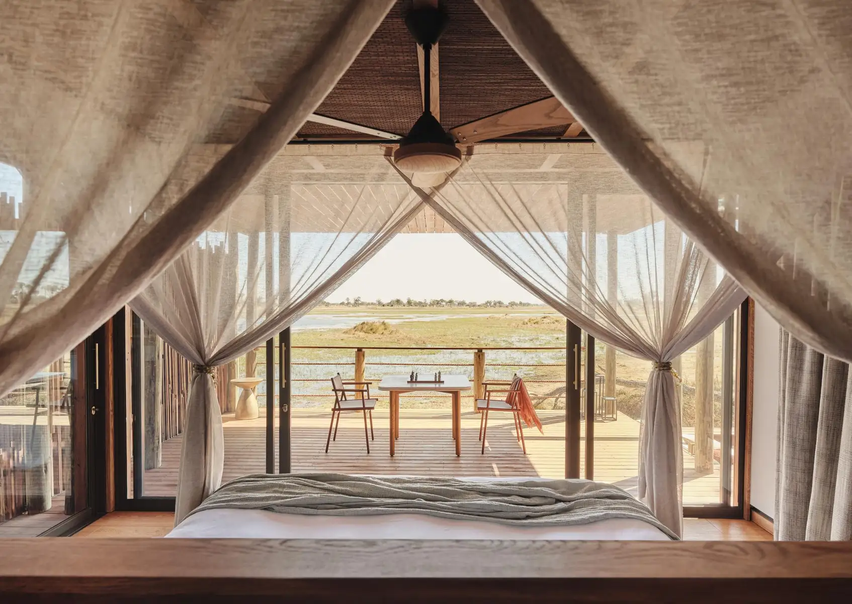 Hand-built as a contemporary extension of the wilderness, 10 spacious bush pavilions are suspended above the Delta's floodplains. Floor-to-ceiling windows showcase the living outdoors, and a private wraparound terrace with plunge pool and nature shower elevate your connections to the surroundings. Spoil yourself with a spa treatment, dine on the finest African cuisine, and include the whole family – a dedicated children's retreat is available!