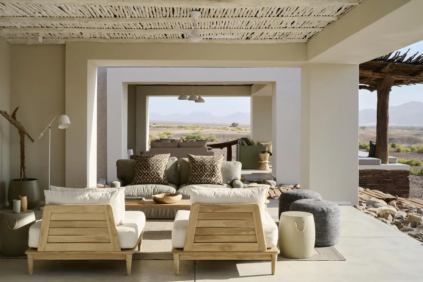 Architecturally, Okahirongo’s style reflects a traditional Himba home, with colours and textures that blend seamlessly into the landscape. The only buildings with doors are the 7 suites, quietly luxurious, air-conditioned, and open enough to showcase giraffes, ostriches, or springboks as they pass by. A large infinity-edge pool is framed by endless views of distant mountains, desert, and bushveld.