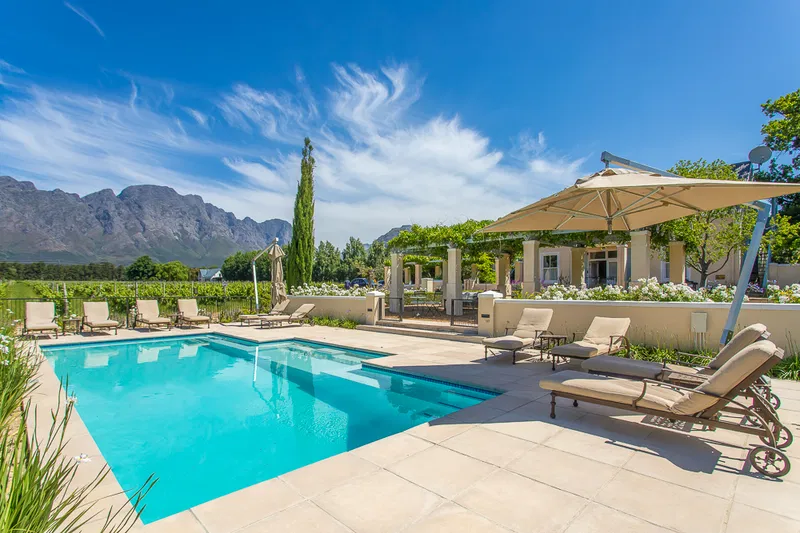 A stylish country guesthouse offers luxury accommodation in the heart of the beautiful Franschhoek Valley on a historic vineyard and fruit farm.