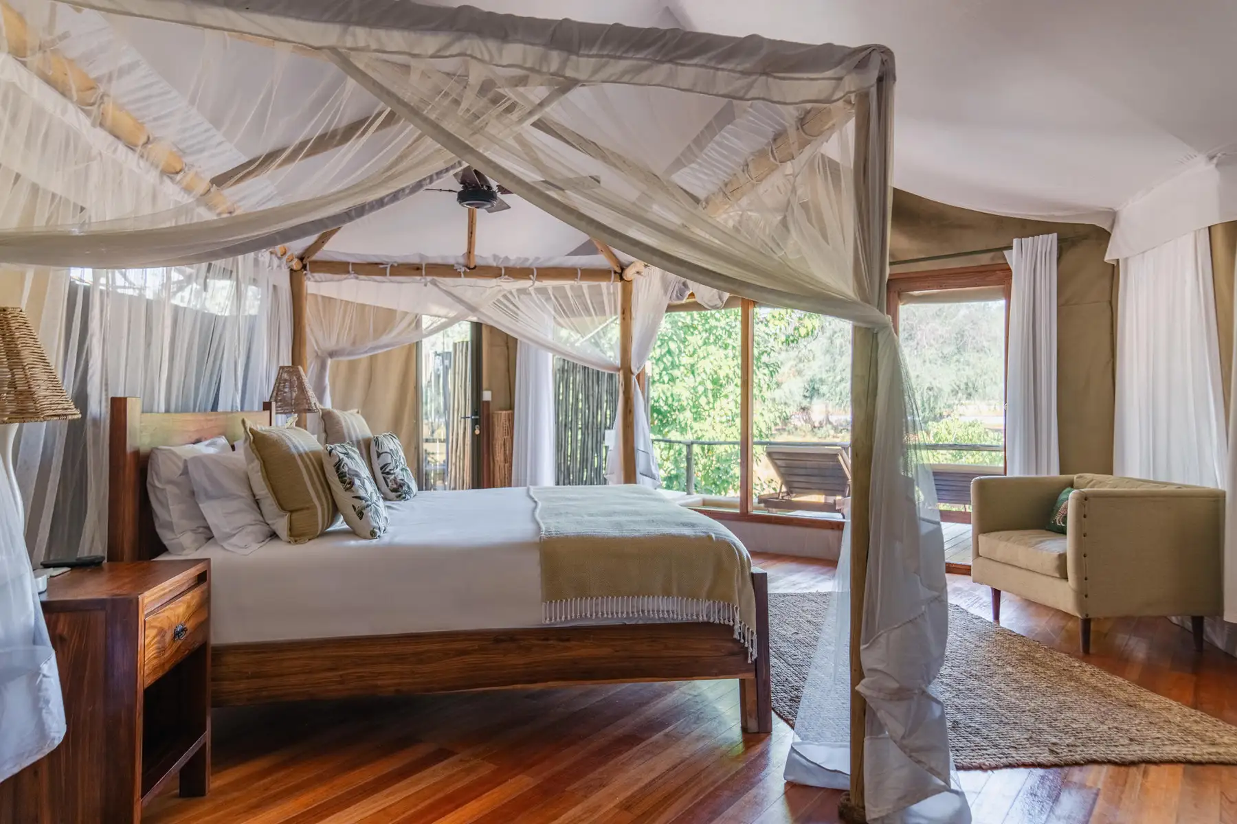 The camp has been artfully designed to harmonise with the local ecosystem. The elevated wooden boardwalks serve a dual purpose: they protect the delicate forest floor and allow animals—ranging from antelope to leopards—to pass through the camp unhindered. This enables guests to observe the rhythm of the bush safely from a superior vantage point.