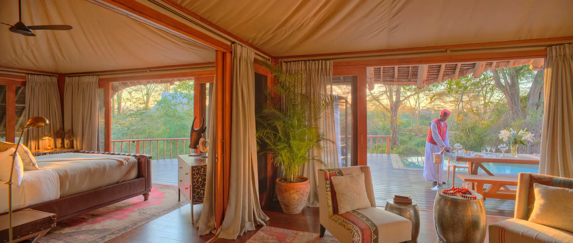 Located near the pool, these suites feature two en-suite bedrooms joined by a central lounge. Families can enjoy extended decks overlooking hippo pools, complete with signature copper bathtubs.